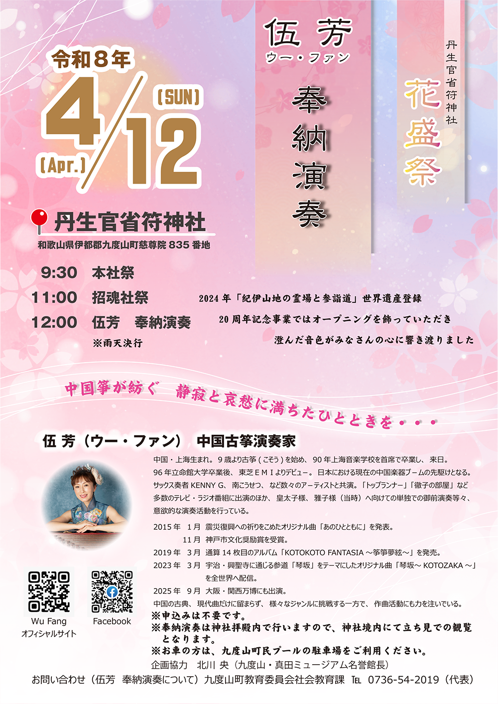 (伍芳奉納演奏については)九度山町教育委員会社会教育課 TEL 0736-54-2019(代表)
